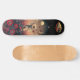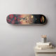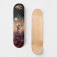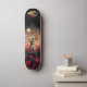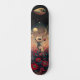 Skateboard för cyberfantasi. En surrealistisk digital grafik som skildrar en robotkatt med humana egenskaper och flyter över rött och rosa blommor i rymdens förgrund. Ovanför dem finns en annan planet som syns genom tunna moln, medan två små flygande sågregat drivs. Bakgrunden innehåller mörk himlar, som skapar kontrasten mellan ljus och skugga.