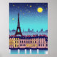 En stiliserad fantasi av Parisskylten, under ett blått, stjärnfärdigt himlar, med fullt
