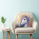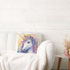 Dekorativ kudde med en majestät enmajs med en gyllene horn omgiven av vibrerande blommor. Dess mane flyter i skuggor av lila, rosa och blått, och blandas sömlöst in i en mjuk, drömmande bakgrund.