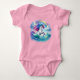En vacker färgstark enhörning blåser i akvamarin vågar i en fantasivärld under en vibrerande regnbåge.