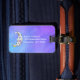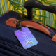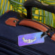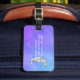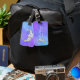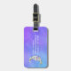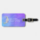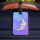 Bagagetaggen har en fantastisk måne med ansikte dekorerad med färgfulla geometriska former och en lila rulla och guld stjärnor på lila himmel. Anpassa ditt namn och adress på framsidan med mallen.