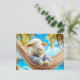Ett luddigt får som på ett fredligt sätt blundar i en hammock under det tropiska handflatan-träd, med ett drömt blå himmel ovan. En humoristisk och lekfull illustration som blandar helgdag vibes med ett fåras flytande lugn.