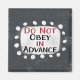 Fetstift med texten "Obey In Advance" centreras mot en grått bakgrund. Den svarta och röda texten sitter på en vit rektangel med stora texturerade vita punkter runt den, vilket ger en lekfull kontrast mot den solida bakgrunden i färg. Lesson #1 från "On Tyranny" av Timothy Snyder.