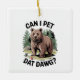 Ett typiskt exempel på en björn som bär en hundhalsband med namn bricka, som står på en skogsgård. Texten ovanför och under björnen lyder humoröst: "Får jag äta Dat Dawg?" En lekfull och kreativ design som kombinerar humor och natur.