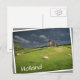 Fotovykort av några får i gröntens gräs framför tre vindkraftverk under en mörk himmel med regnmoln precis före en vår storm i ett landskap i Leidschendam, Nederländerna med vitt kant och texten "Holland". Bilden roteras en bit för att skapa illusionen att den lossnar.