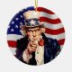 Runda keramiska prydnadsföremål med en vintage på 1940-talet av farbror Sam på den amerikanska flagga. Baksidan är marinerad med valfri text. Se hela Patriotic 40s Ornament-samlingen i SPECIELLA TUUCHES | Avsnittet Party favors.