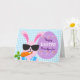 Glad påsk farfar Joe, pappershälsningskort med en rosa cool påskhare som håller en stor orange morot i tänderna. Ljus och färgrik digital konst design med anpassningsbara textområden på omslaget och insidan. Konst, bild och vers copyright © Shoaff Ballanger Studios, 2025.