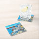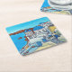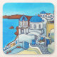 Vibrant, stiliserad målning av vackra Santorini, Grekland med sin stora blå domän av den populäre konstnären Lisa Lorenz på en underlägg.