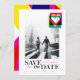 En trendig designs driven spar datuminbjudan fotokort med en stark färgpop i CMYK tryckstil.