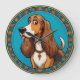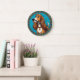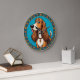 En färgstark tecknad-stil-design med en välsmakande valp med ett hjärtformat plåster och tealkedja mot en levande orange och blå bakgrund, som symboliserar glädje, komplementaritet och vibrerande estetik.
