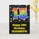Framsidan av den här spännande, roligt- och högtidliga prickkortsdesignen har många färgstarka stjärnformer, tillsammans med siffran "15" med en flerfärgad regnbågsinspirerad spektrumövertoning mönster, på en svart färgad. På framsidan finns också ett meddelande om födelsedagen hälsning, inklusive en personlig som tar emot namn. Insidan innehåller ett anpassat hälsning-födelsedagsmeddelande eller kan kanske tas bort och lämnas tomt om ett meddelande ska skrivas för hand i stället. Ett sådant här födelsedagskort i anpassadet kan vara ett roligt för att erkänna någons femtonårsdag. [~Z0000348]