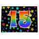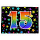 Den här spännande, roligt- och vibranta presentsäcksdesignen har en mönster av färgstarka stjärnformer, tillsammans med siffran "15" med en flerfärgad regnbågsinspirerad spektrumövertoning mönster, på en svart färgad. En presentpåse som denna kan vara ett sätt att på roligten slå in presenter eller gåvor som ges för någons femtonde födelsedag, eller kanske för ett par femtonde bröllop-årsdagen eller något annat femtonde evenemang. [~Z0000347]