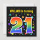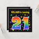 Den spännande, roligt, pulserande födelsedagsfest inbjudan-designen har en färgstark stjärna mönster, tillsammans med siffran "21" med ett multifärgat regnbåge som inspirerar till spektrum eller övertoning mönster. Namn på framsidan kan vara personlig. Baksidan innehåller information om anpassadet om party. Födelsedagsfest inbjudan som detta kan skickas till potentiella deltagare för en födelsedagsfest som hålls för att fira någons tjugoförsta födelsedag. [~Z0000349]