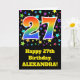 Framsidan av denna spännande, roligt- och högtidliga gratulationskort för födelsedag har flera färgstarka stjärnformer, tillsammans med siffran "27" med en flerfärgad regnbågsinspirerad spektrumövertoning mönster, på en svart färgad. På framsidan finns också ett meddelande om födelsedagen hälsning, inklusive en anpassningsbar som tar emot namn. Insidan innehåller ett hälsning-meddelande från anpassadets födelsedag, eller kan kanske tas bort och lämnas tomt om ett meddelande ska skrivas för hand i stället. Ett födelsedagskort som detta kan vara ett sätt att skicka födelsedagskalender önskemål till någon som firar sin tjugosjunde födelsedag på i roligt. [~Z0000348]