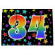 Denna spännande, roligt och klara presentsäck har en färgstark stjärna fält inspirerat mönster, tillsammans med siffran "34" som har ett flerfärgat regnbågsspektrum som mönster, på en svart färgad. En presentpåse som denna kan vara ett sätt att på roligten slå in presenter eller gåvor som ges för någons trettiofjärde födelsedag, eller kanske för ett par trettiofjärde bröllop-årsdag eller något annat trettiofjärde evenemang. [~Z0000347]