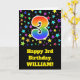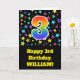 Framsidan av det spännande, roligt- och livfulla gratulationskortet för födelsedag har en färgstark mönster av stjärnformer, tillsammans med siffran "3" med ett flerfärgat regnbågsspektrum som mönster, på en svart färgad. På framsidan finns också ett meddelande om födelsedagen hälsning, inklusive en personlig som tar emot namn. Insidan innehåller ett hälsning-meddelande från anpassadets födelsedag, eller kan kanske tas bort och lämnas tomt om ett meddelande ska skrivas för hand i stället. Ett sådant här födelsedagskort i anpassadet kan vara ett roligt för att erkänna någons tredje födelsedag. [~Z0000348]