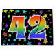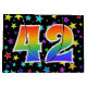 Den här spännande, roligt- och vibranta presentsäcksdesignen har många färgstarka stjärnformer, tillsammans med siffran "42" med en flerfärgad regnbågsinspirerad spektrumövertoning mönster, på en svart färgad. En presentpåse som denna kan vara ett sätt att på roligten slå in presenter eller gåvor som ges för någons fyrtioandra födelsedag, eller kanske för ett pars fyrtioandra bröllop-årsdag, eller något annat fyrtioandra evenemang. [~Z0000347]