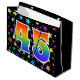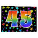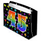 Den här spännande, roligt- och vibranta presentsäcksdesignen har en färgstark stjärna mönster, tillsammans med siffran "45" med en flerfärgad regnbåge inspirerad av spektrumövertoningen mönster, på en svart färgads bakgrund. En presentväska som denna kan vara en roligt, ett sätt att slå in gåvor eller presenter på för någons fyrtiofemårsdag, eller kanske för ett par fyrtiofemte bröllop-årsdag eller något annat fyrtiofemte evenemang. [~Z0000347]