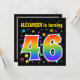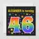 Den spännande, roligt, pulserande födelsedagsfest inbjudan-designen har en färgstark stjärna mönster, tillsammans med siffran "46" med ett multifärgat regnbåge som inspirerar till spektrum eller övertoning mönster. Namn på framsidan kan vara personlig. Baksidan innehåller personlig om party. Födelsedagsfest inbjudan som detta kan skickas till gäster från inbjudan till en födelsedagsfest som hålls för att fira någons fyrtiosjätte födelsedag. [~Z0000349]