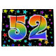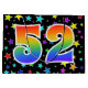 Den här spännande, roligt- och vibranta presentsäcksdesignen har en mönster av färgstarka stjärnformer, tillsammans med siffran "52" med en flerfärgad regnbågsinspirerad spektrumövertoning mönster, på en svart färgad. En presentsäck som denna skulle kanske vara ett sätt att slå in presenter eller gåvor som ges för någons femtioandra födelsedag, eller kanske för ett par femtioandra bröllop-årsdagen, eller något annat femtioandra evenemang. [~Z0000347]