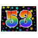 Den här spännande, roligt- och vibranta presentsäcksdesignen har en mönster av färgstarka stjärnformer, tillsammans med siffran "53" med en flerfärgad regnbågsinspirerad spektrumövertoning mönster, på en svart färgad. En presentsäck som denna kan vara en roligt, ett sätt att slå in gåvor eller presenter på för någons femtiotredje födelsedag, eller kanske för ett par femtiotredje bröllop-årsdag eller något annat femtiotredje evenemang. [~Z0000347]