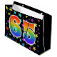 Den här spännande, roligt- och vibranta presentsäcksdesignen har en mönster av färgstarka stjärnformer, tillsammans med siffran "65" med en flerfärgad regnbågsinspirerad spektrumövertoning mönster, på en svart färgad. En presentsäck som denna kan vara en roligt, ett sätt att slå in gåvor eller presenter på för någons sextiofemte födelsedag, eller kanske för ett par sextiofemte bröllop eller någon annan 65e. [~Z0000347]