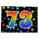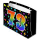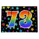 Den här spännande, roligt- och vibranta presentsäcksdesignen har flera färgstarka stjärnformer, tillsammans med siffran "73" med en flerfärgad regnbågsinspirerad spektrumövertoning mönster, på en svart färgad. En presentsäck som denna skulle kanske vara ett sätt att slå in presenter eller gåvor som ges för någons sjuttiotredje födelsedag, eller kanske för ett par sjuttio tredjedels bröllop-årsdag, eller något annat 73:e evenemang. [~Z0000347]