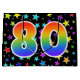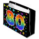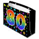 Den här spännande, roligt- och vibranta presentsäcksdesignen har flera färgstarka stjärnformer, tillsammans med siffran "80" med en flerfärgad regnbågsinspirerad spektrumövertoning mönster, på en svart färgad. En presentsäck som denna kan kanske vara ett sätt att slå in gåvor eller presenter på roligt och lycklig för att ge dem 80-årsjubileum, eller kanske för ett pars åttionde bröllop-årsjubileum eller något annat 80-årsevenemang. [~Z0000347]