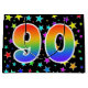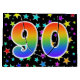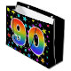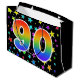 Den här spännande, roligt- och vibranta presentsäcksdesignen har en färgstark mönster av stjärnformer, tillsammans med talet "90" med ett flerfärgat regnbågsspektrum som övertoningen mönster, på en svart färgad. En presentpåse som denna kan vara ett sätt att på roligten slå in presenter eller gåvor som ges för någons nittioårsdag, eller kanske för ett pars nittioårsjubileum bröllop eller någon annan 90:e händelse. [~Z0000347]