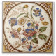 Reproducerad från en ursprunglig antik överföringsprogrampanel. Transferware-plattor trycktes i en färg, i den här fodralen en sepiabbrunt, och sedan applicerades färger för hand. Den här har trädgårdsblommor i ett runt ram. Färger omfattar blått, ro, rosa, gult, brun och grönt.