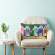 En färglös lumbalfyllning eller dyna med färgad Beach Huts, Fiskmås och en hink och spade på sanden. Från en handmålad papper kollage av Judy Adamson.
