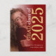 Färgad bild vinröd guld 2025 examen. En stilren typografi och foto med en gradvis färgövergång för att meddela nyheten om din gymnasieelev som har tagit examen, med stilren stor text som roteras och placeras på höger sida högst upp i guld och vitt på ett praktiskt vykort. Anpassa enkelt resten av texten, inklusive ditt meddelande på baksidan, och byt ut fotot mot ditt eget.