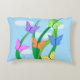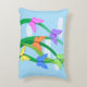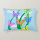 En ljus och glad kudde med min design av sex fjärilar av lila, grönt, blått, orange, rosa och gult på blad av gräs under en blå himmel med fuktiga vita moln.