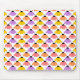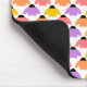 Den här musknappen har en design av reflexer som är spridda över utformningen i gult, orange, rosa och lila på en vit fält.