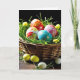 Färgfulla, dekorerade Påskägg kapslas in i ett grästäckt torktumlare basket, tillsammans med några gulter vår blommor. Fler odekorerade ägg sprids runt grund för att göra ett vackert Påsk-kort.