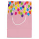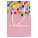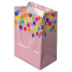 Den här söta flickans födelsedagspressväska har en bild av en bukett med lysande ballonger i färgaden som viftar i vinden. Bakgrunden är en mjuk rosa som gör den här presentsäcken perfekt för en liten flicka.