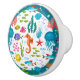 Färgfull tecknad i coola illustrerar havsdjur och havsväxter i ett sömlöst mönster. Vit cirkelbakgrund och gräns med teal-grönt. Havshäst, bläckfisk, fiskkoraller i stor mängd färg.