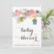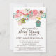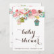 illustration av rosa och bruna fåglar omgivna av vita och färgstarka blommor och hängfågelhus. Den här inbjudan blir perfekt till sommar- och vår-babyduschar. Det blir också underbart för både "det är en flicka" och "det är en pojke" babyduschar eller till och med dubbla babyduschar.