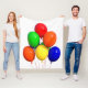 "Öka ditt utrymme med den här vibrerande fleece-filten, med en storlek på 50" x60". Den här filten har en glad utformning av färgstarka ballonger och fångar glädjen och roligten hos ett festive firande. Den är tillverkad av ultramjuk ull och erbjuder värme och komfort samtidigt som den ger en lekfull beröring till din hemdekoration. Perfekt för kokning på kyliga dagar eller som färglöst accent biet i vilket rum som helst."