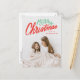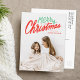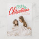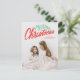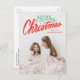Färdigt, modernt vykort för helgdag med "God jul" i ett rött och grönt handskrivet manusöverlägg. Anpassa framsidan av trendigets vykort för helgdag genom att lägga till foto och namn. Baksidan av vykortet för helgdag innehåller din returadress, ytterligare ett foto och ett anpassningsbar-meddelande.