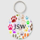 Bilder i hund tass avtryck överallt. Färgfull tecknad stil-design. Anpassningsbarnas nyckelkedjor för hundälskare. Redigera initialer om du vill anpassa. Gift idé.