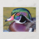 Vykort med en profil av nära det färgstarka manliga träet anka. Du kan se detaljer om hans berikande vackra grönt, blått, vitt och kastanjepumage, kryddade huvudfjädrar och rödaktigt ögon och näbba. Perfekt kort för anka och älskare. Foto taget i Arcadia, Kalifornien.