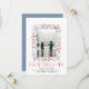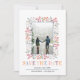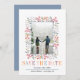 Bröllopet Spara datum meddelande under vintern mellan Berries och löv gräns. På framsidan finns en ram som består av bär och löv, texten "Spara datum" i ett färgstarkt teckensnitt och ett foto. Baksidan är av fast dammblått färg.