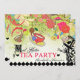 Mad Hatter Inbjudningskort för möhippan. Så mycket roligt och detaljrikedom i inbjudningskort för möhippan med ett galna hatterte party. Har en grönt bakgrund med en punkt mönster och blommor överlagras försiktigt ovanpå den. Olika ljusa blommor, vinstockar, träd, grenar och blomstra inslag får stå överst på sidan. De här blommorna är te kopp och tekannor för att visa tetemat party. Den galna hataren sitter på högerna av sidan och ser på kopp-galenheta på vinet. Alla dina uppgifter om party finns på baksidan. (madaterns bild inköpt av slutlager).