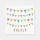 Färgfull buntning av flaggor med namn födelsedagsfest blöjor för barn. Utformning av kalkfödelsedagen för barn med party som buntar flaggor i grönt, rött och blått färg och namn - personliggör napkin med ditt barns namn. Din pojke eller flicka och gästerna kommer att kärlek de här söta party-servetterna.