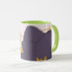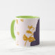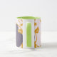 Söt och färgstark grafik, rosa, lila, brun på ljust grönt mugg.