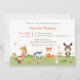 Färgfullt och vismiskt inbjudningskort för babydusch för skogstema med illustration av en räv, räv, hjort, ekorre, mosa och kanin. Denna utformning är könsneutral.