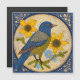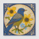 Färgfull illustration av en fågel på gren, omgiven av gula blommor och blå daisy. Bilden har en prickad mönster och en harmonisk blandning av blå, gult och ärliga toner, som skapar en glad och livlig sammansättning.