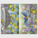 Bluebirds och goldfinkar som njuter av ett fågelbad i fontän i en färglös blomsterträdgård i vår av lila clematis som klamrar sig fast vid en vit betesstaket, och gult och blå daisy nedanför. Artwork by wildlife and equine artist Crista S. Forest.