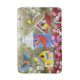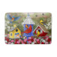 En vackert målad scen av en mängd sångfåglar och färgade födelsehus i en trädgård som blommar med hundträ och kosmos blommor. Röda, gult och blå fågelhus är hem till östra bluebirds, nordliga röda kardinaler och amerikanska guldfinkar.
